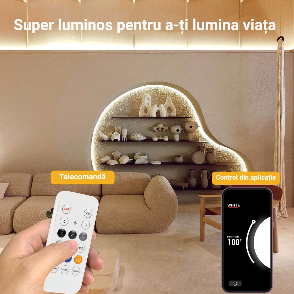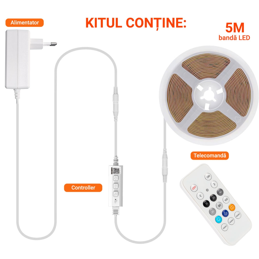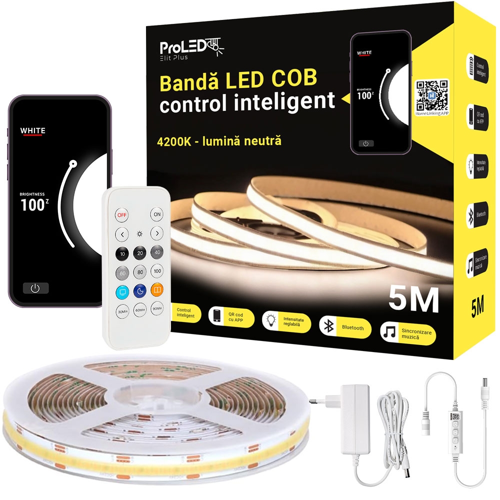 Kit banda LED COB 5M APP 4200K, control inteligent, QR cod, sincronizare muzica si intensitate reglabila - Banda led > Kit banda led 220V