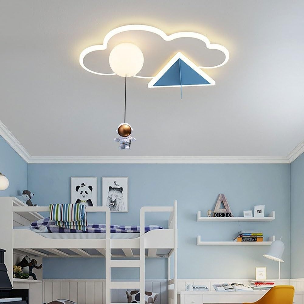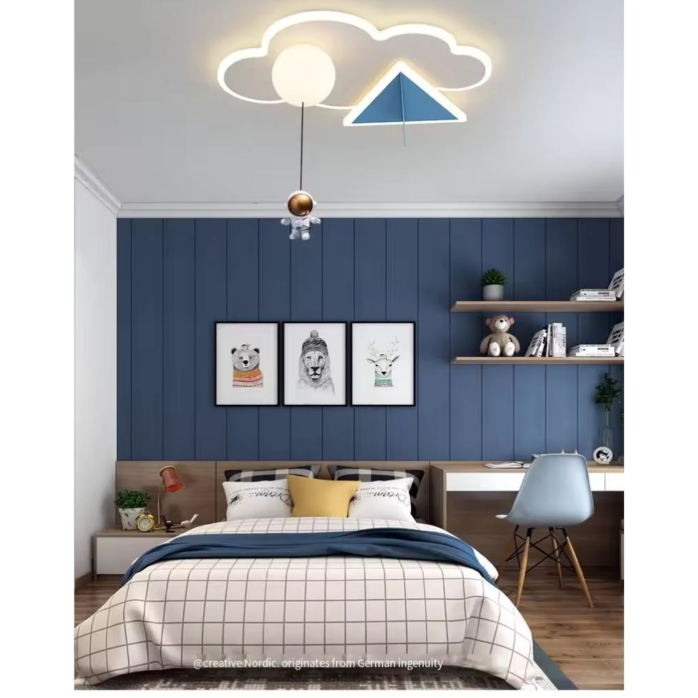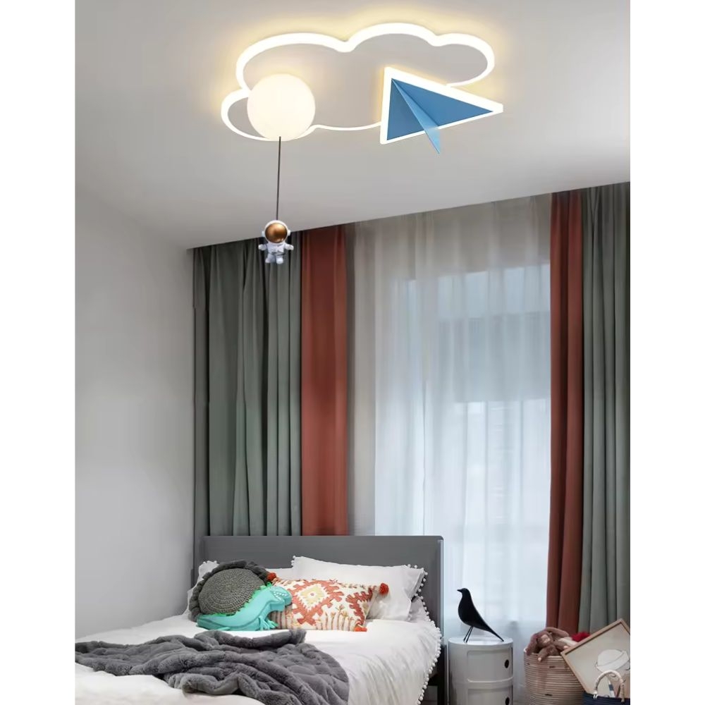 Fiecare detaliu al acestei lustre a fost gândit pentru a adăuga o notă de magie și explorare în camera copilului. Norișorul alb simbolizează visurile neînfrânate, avionul albastru reprezintă curajul de a explora noi orizonturi, iar cosmonautul suspendat de balon aduce cu sine promisiunea aventurilor cosmice neînchipuite.